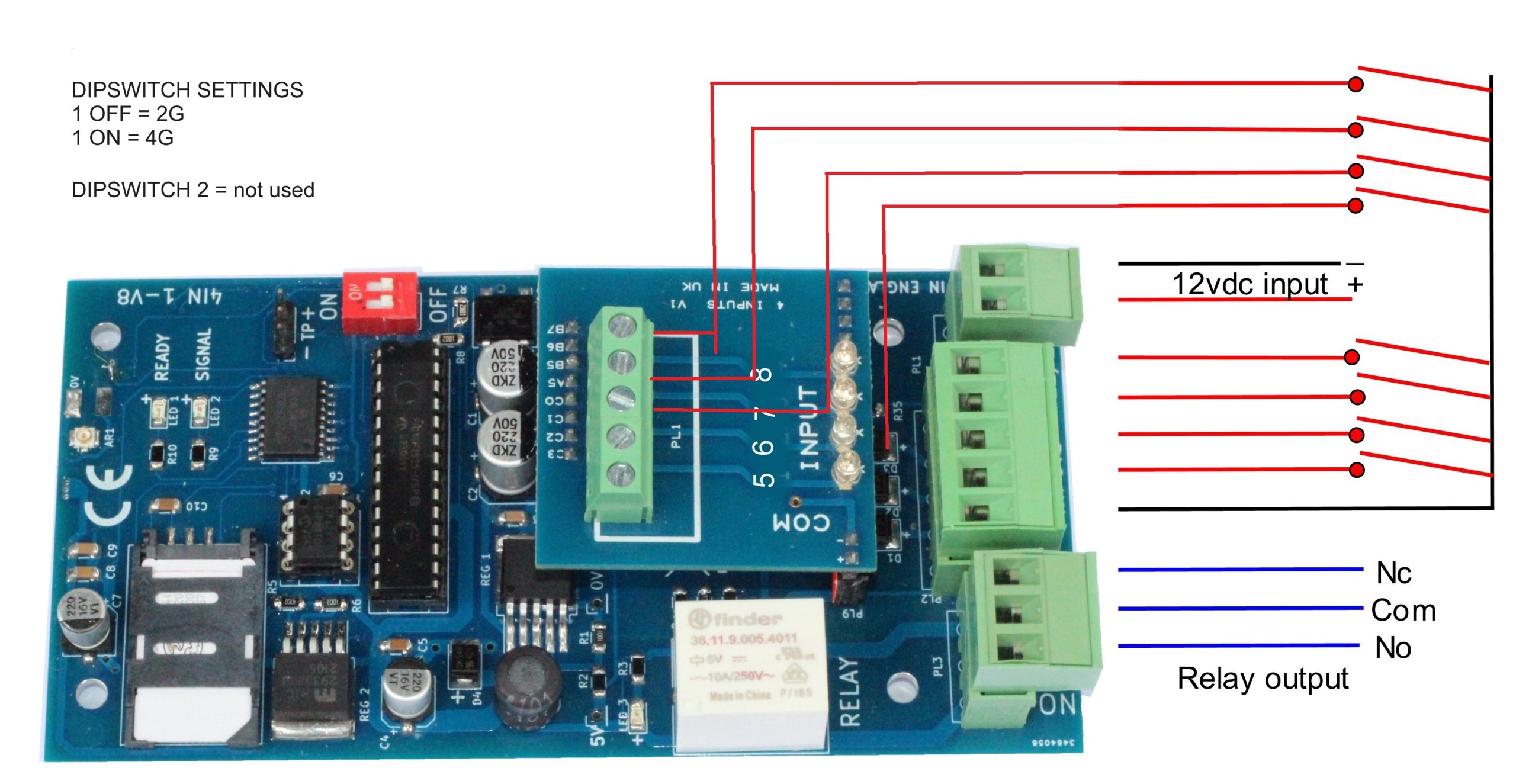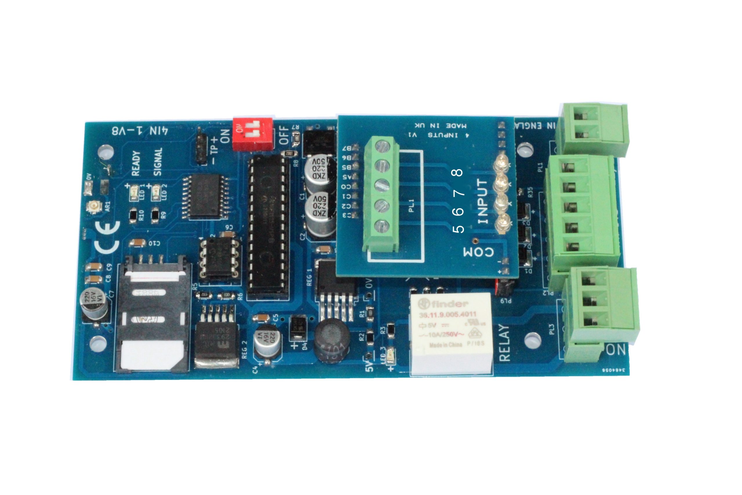 - 8 Input Plug in Board – An Extra 4 Inputs can be added via this plug in board, the dialler will also trigger on open and close of the input